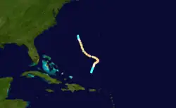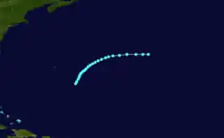 On September 22, the bark Mary encountered this storm north of Puerto Rico.[56] Early the next day, the tropical storm intensified into a hurricane as it headed northeastward and then into a Category 2 on September 24. The system peaked with winds of 100 mph (155 km/h),[11] based on the Mary recording an atmospheric pressure of 990 mbar (29 inHg).[57][37] on September 25, the brigantine Pearl recorded sightings of ball lighting and "St. Elmo's light at the yard-arms" September 25.[56] The storm turned northwestward by September 26 and maintained this intensity until September 30, when it weakened to a Category 1 hurricane. Shortly thereafter, the system weakened to a tropical storm and was last noted about 305 mi (490 km) west of Bermuda.[11] Chenoweth's reanalysis study argued that this cyclone instead developed just north of the Leeward Islands on September 20 and initially trekked northwestward until moving erratically for a few days. The storm headed in a more northerly direction from September 29 to October 1, at which time it accelerated northeastward, several hours before becoming extratropical.[22]