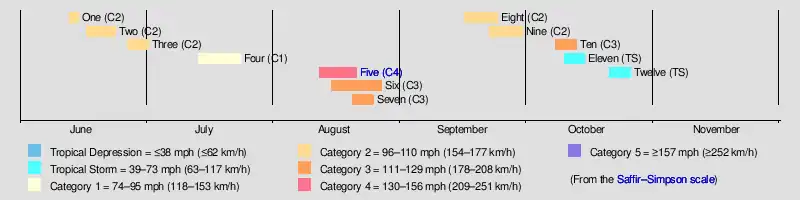 Although other storms may have gone undetected, tropical activity first began on June 13 with the formation of the first tropical storm over the western Gulf of Mexico. Two other storms formed before the end of the month and also reached the Gulf of Mexico. All three of the storms each attained hurricane intensity and eventually made landfall on the U.S. Gulf Coast with sustained winds of 100 mph (155 km/h).[11] About two weeks later in mid-July, another storm formed over the western Caribbean moved northward before striking the west coast of Florida as a hurricane. This is after two earlier stronger storms had already done so in the state. Never before or since have so many hurricanes struck Florida in the same season before the month of September.[16] Three storms, all of which attained major hurricane intensity, formed in close succession, over a span of eight days, in August. The first of these, the Indianola hurricane, was the strongest and most intense tropical cyclone of the season, striking multiple islands in the Greater Antilles before rapidly strengthening over the western Gulf of Mexico. It struck the U.S. state of Texas on August 20 with sustained winds of 150 mph (240 km/h), tying it with the 1932 Freeport hurricane for the strongest storm to do so. It was also one of the most intense to have struck the continental U.S., and the strongest in Texas measured solely by central pressure, at 925 mbar (27.3 inHg).[15]