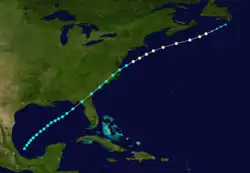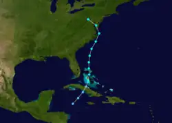 A tropical depression likely developed over the northwestern Caribbean on October 20.[3] However, some reassessments of the storm show movement over Florida and others over Cuba.[67] The official track of the cyclone elects for a landfall in the Cuban province of Ciego de Ávila near the municipality of Venezuela. After crossing the island, the cyclone emerged into the Atlantic and intensified into a tropical storm shortly before striking Andros in the Bahamas on October 21. Moving generally northward, the storm passed over the Abaco Islands or Grand Bahama later that day. Sustained winds increased to 60 mph (95 km/h) on October 22 as the system began curving northeastward. Around 03:00 UTC the next day, the cyclone made landfall near Cape Hatteras, North Carolina. A turn to the northwest after crossing the Outer Banks caused the storm to make another landfall around 11:00 UTC on October 23 near Chincoteague, Virginia. The system was last noted over Pennsylvania several hours later.[3]
