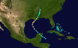 The official Atlantic hurricane database begins the track for this cyclone on September 4 over the northwestern Caribbean, based on land observations around the Gulf Coast of the United States from the following day.[47] Moving northwestward, the storm crossed the Yucatán Peninsula as a tropical storm but intensified into a hurricane over the Gulf of Mexico on September 6.[3] Due to damage caused by the system, it is estimated to have strengthened into a Category 2 hurricane with winds of 100 mph (155 km/h) later that day while turning to the northeast.[4][48] Around 14:00 UTC on September 7, the hurricane made landfall near Dulac, Louisiana, at the same intensity and with an estimated barometric pressure of 970 mbar (29 inHg).[4] The system weakened to a tropical storm early the next day and then to a tropical depression over northern Mississippi early on September 9, several hours before dissipating over southwestern Tennessee.[3]