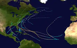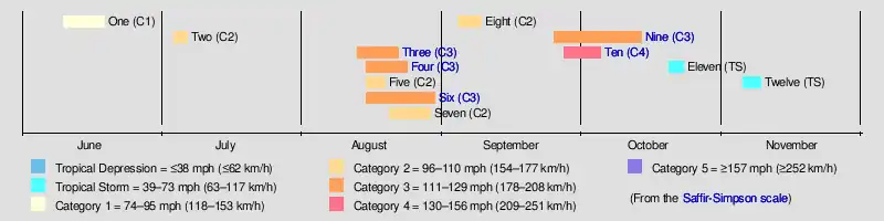 On June 12, ships initially detected the first known tropical cyclone of the season over the Bay of Campeche.[6] After crossing the Southeastern United States, the storm intensified into a hurricane, but became extratropical on June 19. July also featured one system, which peaked as a Category 2 hurricane on the present-day Saffir–Simpson scale and made landfall in Nicaragua and Belize (then known as British Honduras). Tropical cyclogenesis increased significantly in August, with five cyclones, all of which intensified into at least a Category 2 hurricane.[3] On August 22, the season's third, fourth, sixth, and seventh all existed at hurricane intensity. The only other instance of four active simultaneous hurricanes in the Atlantic occurred on September 25, 1998.[7] Three storms, each also all hurricanes, are known to have developed in September. The season's tenth system, which formed on September 27, became the most intense of the season on October 2, peaking as a Category 4 with maximum sustained winds of 130 mph (215 km/h) and a minimum atmospheric pressure of 948 mbar (28.0 inHg). One cyclone each formed in October and November. The season's twelfth and final known system transitioned into an extratropical cyclone on November 9 over the northwestern Atlantic.[3]