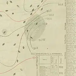 A low-pressure area became a tropical storm on November 5,[71] situated about 385 mi (620 km) east of Marsh Harbour in the Bahamas,[3] though Partagás noted the possibility of the system having subtropical characteristics.[72] The storm gradually turned west-northward and then northward. On November 8, the cyclone passed within 50 mi (80 km) of the Outer Banks of North Carolina with winds of 70 mph (110 km/h) but curved northeastward and remained offshore. The system then shifted east-northeastward on November 9 and transitioned into an extratropical storm that day. The extratropical remnants dissipated near the Azores on November 12.[3]