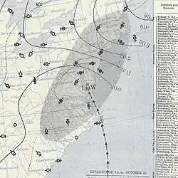 In the Bahamas, Nassau and the surrounding area reported heavy rainfall on October 21 and October 22, including 7.17 in (182 mm) of precipitation on the latter, the largest accumulation in a 24-hour period there since 1879. In low-lying parts of eastern Nassau and Grants Town, water up to several inches deep surrounded homes.[68] The storm caused gales and heavy precipitation from Hatteras, North Carolina, to Sandy Hook, New Jersey.[69] In North Carolina, Kitty Hawk observed sustained winds of 54 mph (87 km/h).[28] Western Union reported that 25 of their communication wires were downed between Washington, D.C. and New York City.[70] Chenoweth proposed removing the cyclone from HURDAT, noting that it was "most likely an extratropical system".[5]