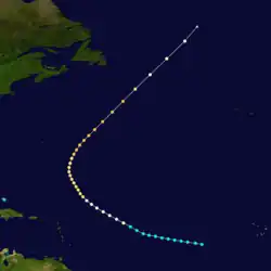 A tropical storm was first observed on August 30 near 14°N 38°W / 14°N 38°W / 14; -38, which is approximately 700 mi (1,125 km) west-southwest of Cape Verde.[12] The system slowly intensified while moving generally west-northwestward and then northwestward by September 1. Early on the following day, the storm strengthened into a hurricane. Around 18:00 UTC on September 3, the cyclone intensified into a Category 2 hurricane on the modern-day Saffir–Simpson scale and soon turned north-northwestward. The hurricane re-curved again by early on September 6 and reached Category 3 hurricane intensity later that day, peaking with winds of 115 mph (185 km/h).[5] Several steamships encountered the hurricane on September 8 and September 9, including the Othello, which observed a barometric pressure of 948 mbar (28.0 inHg),[12] the lowest known pressure in relation to the storm.[5] Additionally, the schooner Origin became caught in the storm, which damaged several parts of the ship and threw one person overboard, who drowned.[13] The hurricane weakened and lost tropical characteristics as it accelerated northeastward, transitioning into an extratropical cyclone about 500 mi (805 km) southeast of Greenland late on September 9.[5]