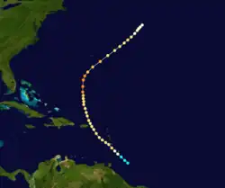 Although atmospheric pressures began to fall near Trinidad on October 10, the presence of a cyclone could not be confirmed until the following day.[37] Located approximately 215 mi (345 km) east of Trinidad, the tropical storm moved northwestward and strengthened into a hurricane late on October 11. During the following day, the storm passed near Barbados and then struck Saint Lucia at Category 2 intensity. The hurricane crossed through the western Virgin Islands early on October 14 before re-emerging into the Atlantic. Curving northward, the cyclone intensified significantly on October 16,[5] with the ship Herschel observing a barometric pressure of 931 mbar (27.5 inHg).[38] Consequently, the storm is estimated to have peaked as a Category 4 hurricane with winds of 130 mph (215 km/h). On October 17, the system began weakening and turning to the northeast, passing southeast of Bermuda. The storm was last noted on October 20, with the track ending approximately 460 mi (740 km) southeast of Sable Island.[5]