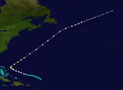 Based on observations and reanalysis by Fernández-Partagás and Diaz,[42] the track for this storm commenced about 265 mi (425 km) northeast of the Lesser Antilles on October 21. Moving generally west-northwestward, the tropical storm is estimated to have intensified into a hurricane two days later. After briefly stalling east of the Bahamas on October 25, the hurricane turned northeastward. The system then moved about 50 mi (80 km) northwest of Bermuda late the following day as a Category 2 hurricane. Slightly further strengthening occurred as the storm passed southeast and then east of Atlantic Canada. Early on October 29, the hurricane peaked with winds of 110 mph (175 km/h) and a minimum pressure of 955 mbar (28.2 inHg),[5] based on observations from the ship Maryland.[3] Several hours later, however, the storm transitioned into an extratropical cyclone, which continued northeastward until dissipating west of Ireland on October 31.[5]