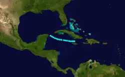 This system was first observed well east of the Lesser Antilles on September 18. Gradually intensifying as it headed west-northwestward, the cyclone became a hurricane on September 19 and a major hurricane on the next day while passing near Martinique. After entering the Caribbean, the storm peaked with winds of 120 mph (195 km/h) on September 21, but weakened to a Category 2 hurricane before striking the Dominican Republic on September 22. The system weakened to a Category 1 hurricane before reaching the Gulf of Gonâve, but briefly became a Category 2 hurricane again before striking Cuba near Santiago de Cuba on September 23. Moving west-northwestward along or near the south coast of Cuba, the hurricane turned northward over Matanzas Province on September 24 and briefly weakened to a tropical storm.[5]