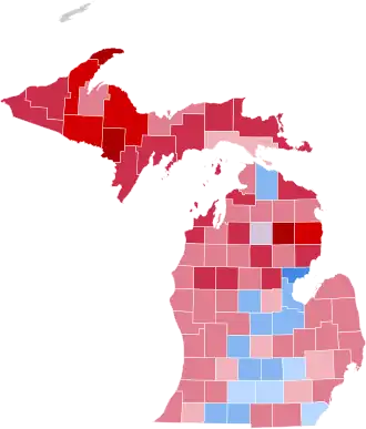 Michigan ultimately voted for McKinley by a margin of 10.3 points, a much smaller margin than earlier polls, although a reduction was expected as some unpolled rural areas of the state had been believed to favor Bryan's free silver policy.[6] His margin was an increase of five points upon what Benjamin Harrison had achieved over the state as a whole in 1892, though there were large variations. In the traditionally Democratic German Catholic areas, there was a large shift to McKinley due to Archbishop Ireland's opposition to free silver,[7][8] In the heavily Methodist cabinet counties of Michiana, by contrast, Bryan gained substantially and was the first Democratic presidential candidate to carry Branch County, Calhoun County, Eaton County and Isabella County since Franklin Pierce in 1852.[9]