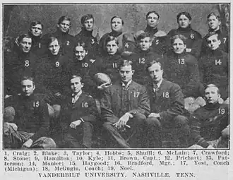 The 1905 Vanderbilt Commodores football team represented Vanderbilt University during the 1905 Southern Intercollegiate Athletic Association football season.[1] The team's head coach was Dan McGugin, who served his second season in that capacity. Members of the Southern Intercollegiate Athletic Association, the Commodores played six home games in Nashville, Tennessee and finished the season with a record 7–1 overall and 6–0 in SIAA, outscoring their opponents 372–22 . Vanderbilt played seven home games and won them all including six shutout victories.