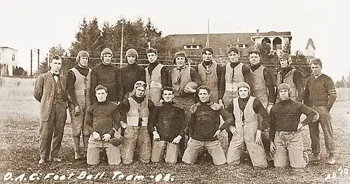 On the neutral turf of Multnomah Field in Portland, the OAC Aggies suffered a bitter defeat at the hands of their rivals from down the road, the University of Oregon Webfoots.[9] Some 1,260 fans packed a special train running up the valley to Portland for the annual gridiron showdown between the state's two most prominent schools.[9] OAC army cadets wore their uniforms, banners were waved, megaphones were raised, and enthusiasm was at a peak. Performance on the field left something to be desired, however, as one local newspaper lamented: