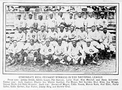 Cincinnati put together a record of 24–7 in their next 31 games, moving to a 44–23 record and into first place in the National League, just ahead of the Giants. By the end of July, despite a very strong 59–28 record, the Reds and Giants were tied for first place. In August, the Reds begin to pull away from the Giants, as on August 26, Cincinnati had a record of 81-34 and had built a nine-game lead over New York. Also in August, there were accusations that the teams playing the Reds were throwing their games to allow the Reds to win.[1] The Reds continued to win in the last month of the season, and on September 18, Cincinnati defeated the Brooklyn Robins 2–0 to win their 93rd game of the season, which set a team record, besting the 92 wins the club had in 1898. Overall, Cincinnati finished the season with a 96–44 record, cruising to the National League pennant, as the team finished in first place for the first time since 1882. The Reds qualified for the 1919 World Series, as they would face the American League champions, the Chicago White Sox.