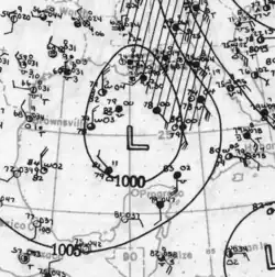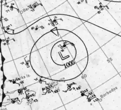 Around August 31, a low-pressure area formed along the tail end of a cold front extending from the Bahamas to Bermuda.[4] Early on the following day, a tropical depression developed roughly 510 mi (820 km) east-southeast of Jacksonville, Florida.[2] The depression moved slowly east-northeastward as the cold front dissipated.[4][2] Late on September 3, the system intensified into a tropical storm, and the next day the cyclone passed northwest of Bermuda.[2] Based on observations from the S.S. Evergreen City, the small storm likely reached Category 1 hurricane intensity early on September 5.[4] The cyclone continued to strengthen, reaching Category 2 intensity on September 6 while drifting northward and then peaking with maximum sustained winds of 105 mph (165 km/h) early the following day. On September 8, the system curved northwestward and weakened to a Category 1 hurricane. The storm then turned north-northeastward on September 9 and transitioned into an extratropical cyclone later that day. The extratropical low continued north-northeastward until dissipating over southern Newfoundland on September 10.[2] Cape Race observed sustained winds of 29 mph (47 km/h).[4]