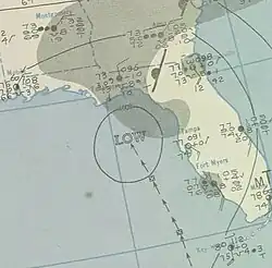 Damage from the hurricane throughout Florida was relatively minor. Citrus trees were stripped of their branches, roadways were washed out, and some telephone and power lines were toppled, temporarily severing communication.[5] Tampa recorded a record 24-hour rainfall total of 10.42 in (265 mm),[3] while precipitation peaked at 13.6 in (350 mm) in Lake Alfred.[6] Statewide, the heavy precipitation was regarded as beneficial in ending one of the worst recorded droughts there.[3] Two tornadoes were spawned; one blew a transformer off a platform and ripped a section of railing off a causeway, while both damaged some homes. Total damage reached $75,000 throughout Miami.[7] Farther north, telephone communications around Georgetown, South Carolina were disrupted, while winds gusted as high as 69 mph (111 km/h) and rainfall peaked at 5.58 in (142 mm) in Charleston.[8] In Wilmington, North Carolina, 8.24 in (209 mm) of rain was observed, causing considerable damage to the city's storm sewer system.[9] Although the core of the cyclone passed east of New England, at least 10,000 telephone lines were downed by the storm. Buildings, crops, and trees were damaged, while low visibility led to a traffic accident that killed a man in Warwick, Rhode Island.[10]
