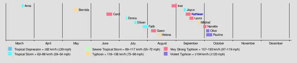 Typhoon Kathleen struck the Boso Peninsula and the entire Kanto Region in Japan on September 15. Heavy rains caused the Arakawa and Tone Rivers to overflow. The resulting floods killed 1,077 people and left 853 people missing.[7]