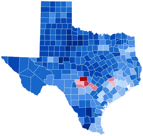 This is the last occasion the Plains counties of Ector, Gray, Hansford, Hutchinson, Lipscomb, Midland, Ochiltree, Randall, and Roberts have voted for a Democratic presidential candidate.[17] In the 21st century, these counties typically give over ninety percent of their vote to Republican nominees, while Roberts and Ochiltree have alternated as the nation's most Republican county. Additionally, 1948 constitutes the last election when Gregg County and Smith County in East Texas, plus Edwards County at the western extremity of its namesake plateau, have voted for the Democratic presidential nominee.[17] As a result of Dallas and Harris counties seeing their populations increase as a result of Republican-leaning northern expatriates moving into the state, this would be the last occasion with the exception of Lyndon B. Johnson's landslide win in the state in 1964 that these two counties backed Democratic presidential candidates until Barack Obama won them back in 2008. As of 2024, Dewey remains the last major party nominee to fail to win at least thirty percent of Texas’s popular vote in a presidential election.