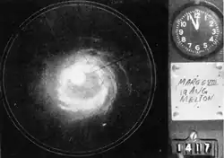 Marge was the largest tropical cyclone ever observed to date, with a wind circulation extending 1,160 km (720 mi) in diameter; this record stood until it was eclipsed by Typhoon Tip in 1979.[28] Meteorologist Robert Simpson flew on board a reconnaissance mission that flew into Marge near its peak strength and documented the eye's visual and sampled characteristics. The flight was an atypical departure from normal reconnaissance missions due to secondary—albeit procedurally constrained—storm-research objectives.[29] Publishing his findings in the Bulletin of the American Meteorological Society in 1952, his work would be instrumental in the understanding of tropical cyclone structure.[30]