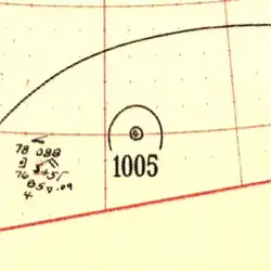 In late April, a well-developed tropical wave began developing east of Chuuk Lagoon.[9] Tracking westward, the easterly wave was analyzed to have organized into a tropical depression by 0000 UTC on April 29.[10] Twelve hours later, Iris was estimated to have strengthened into a tropical storm.[11] At roughly the same time, a vessel in the vicinity of the storm reported winds in excess of 65 km/h (40 mph), prompting the Guam Fleet Weather Center to initiate reconnaissance flights into the cyclone.[7] Midday on April 30, Iris intensified into the equivalent of a modern-day typhoon as it moved in a slightly oscillatory path towards the Philippines.[7][11] After a slight fluctuation in intensity during the overnight hours of May 1, Iris rapidly intensified to reach its peak intensity with a minimum pressure of 909 mbar (909 hPa; 26.8 inHg) and maximum sustained winds of 280 km/h (170 mph) early on May 4,[11] making it the equivalent of a Category 5 super typhoon;[10] at the time this was the first confirmed instance of a typhoon reaching such intensities.[2] Afterwards, Iris weakened slightly before making landfall on South Luzon around 1800 UTC the following day.[11]
