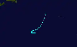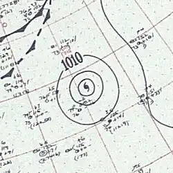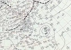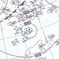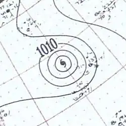 An easterly tropical wave developed into a tropical depression on August 21 in the tropical Atlantic.[4] Moving towards the west-northwest, the disturbance slowly intensified, reaching tropical storm strength at 1200 UTC on August 23 and as such was named Edith by the Weather Bureau.[7][27] Afterwards, Edith began to curve towards the northwest as it gradually intensified, attaining hurricane strength on August 26, but weakened back to a tropical storm early the next day. The storm re-intensified as it northeastward and accelerated, re-attaining hurricane status early on August 29. Edith became a Category 2 hurricane on August 30 and soon peaked with maximum sustained winds of 100 mph (160 km/h) and a minimum pressure of 967 mbar (28.6 inHg).[7] The hurricane began to gradually weaken after it passed east of the island, before becoming extratropical on August 31. The extratropical cyclone would later make a clockwise loop before dissipating completely early on September 5. Although Edith remained at sea,[7] it was suspected that the hurricane may have caused the loss of the pleasure yacht Connemara IV, after it separated from its moorings.[28]