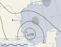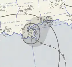 A weak disturbance was first observed near Grand Cayman on August 23.[4] The disturbance moved northeastward into the Gulf of Mexico, where it became a tropical depression late on August 25. Early the next day, the depression intensified into a tropical storm. The tropical storm marginally strengthened further, peaking with maximum sustained winds of 45 mph (72 km/h) by 0000 UTC on August 27. Nearing the Gulf Coast of the United States, the system curved towards the west.[7] The storm maintained its intensity up until landfall in Louisiana near New Orleans about four hours later.[4] Moving inland, it slowly weakened while crossing the Central United States, degenerating to tropical depression strength by August 28 and dissipating over east-central Texas several hours later.[7]