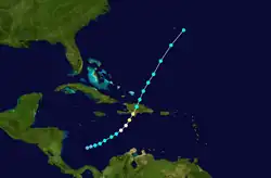 A tropical wave spawned Tropical Storm Hilda north of Puerto Rico early on September 12.[4][7] Hilda quickly intensified while moving westward into a small hurricane by September 13.[7] Although the storm passed just north of Hispaniola on that day, damage is unknown, if any.[4] Later on September 13, Hilda made landfall near the southeastern tip of Cuba on September 13.[7] There, it dropped heavy rainfall and produced gusty winds that destroyed 80% of the coffee crop in Oriente Province.[39] In the eastern Cuban city of Baracoa, Hilda severely damaged the oldest church in the country.[40] Damage totaled $2 million in Cuba,[41] and there were four deaths.[4]