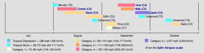 The Atlantic hurricane season officially began on June 15, 1955.[6] It was an above average season in which 13 tropical cyclones formed. In a typical season, about nine tropical storms develop, of which five strengthen to hurricane strength. All thirteen depressions attained tropical storm status, and eleven of these attained hurricane status.[4] Six hurricanes further intensified into major hurricanes.[7] The season was above average most likely because of a strong, ongoing La Niña.[8] Hurricane Alice was named in January 1955 but was operationally analysed to have developed in late December 1954.[9] Within the official hurricane season bounds, tropical cyclogenesis did not occur until July 31, with the development of Tropical Storm Brenda. However, during the month of August, four tropical cyclones formed – including Connie, Diane, Edith, and an unnamed tropical storm. Five additional tropical cyclones – Flora, Gladys, Hilda, Ione, and Janet – all developed in September. Tropical cyclogenesis briefly halted until an unnamed tropical storm formed on October 10.[4] The final storm of the season, Katie, dissipated on October 19,[7] almost a month before the official end of hurricane season on November 15.[6] Eight hurricanes and two tropical storms made landfall during the season and caused 1,603 deaths and $1.1 billion in damage.[4]