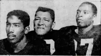 Iowa's "Steubenville Trio": halfback Eddie Vincent (left), guard Cal Jones (center), and end Frank Gilliam (right)