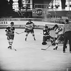 The 1961 Ice Hockey World Championships was the 28th edition of the Ice Hockey World Championships. The tournament was held in Geneva and Lausanne, Switzerland from 1 to 12 March 1961. The games were played outdoors on a frozen pool. A glare made it hard for players to see well, however photographers were able to get aerial pictures from the diving board. Canada, represented by the Trail Smoke Eaters,[1] won their nineteenth international title. It would be 33 years before Canada won another World Championship.[2] By beating out the Soviets for the Silver, the Czechoslovaks won their tenth European title. The final day was marred by political controversy when Willi Daume, president of West Germany hockey, forbade his team to take the ice against East Germany to avoid the possibility of honouring East Germany's new flag.[3]