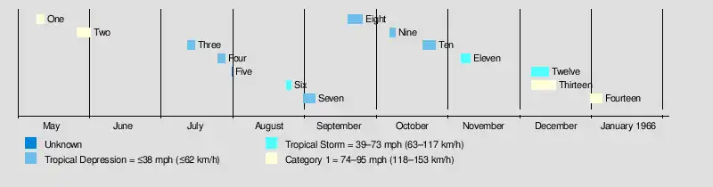 The 1965 North Indian Ocean cyclone season had no bounds, but cyclones tend to form between April and December, with peaks in May and November. The season has no official bounds but cyclones tend to form between April and December. These dates conventionally delimit the period of each year when most tropical cyclones form in the northern Indian Ocean. There are two main seas in the North Indian Ocean—the Bay of Bengal to the east of the Indian subcontinent and the Arabian Sea to the west of India. The official Regional Specialized Meteorological Centre in this basin is the India Meteorological Department (IMD), while the Joint Typhoon Warning Center releases unofficial advisories. An average of four to six storms form in the North Indian Ocean every season with peaks in May and November.[1] Cyclones occurring between the meridians 45°E and 100°E are included in the season by the IMD.[2]