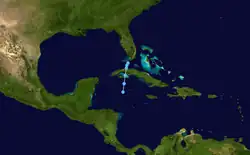 A tropical depression developed near the Yucatan Peninsula on June 7. It moved north, reaching western Cuba by the following day.[7] As the depression moved towards Florida, small-craft warnings were issued for the southern coast.[8] The depression made landfall in Florida on June 9 and dissipated shortly thereafter. As a result of 2 to 3 in (51 to 76 mm) rain in Cuba, Radio Havana warned of a flash flood[8] and later reported that three rivers were overflowing in Camagüey. Flooding also forced 1,801 people from their homes.[9] Sustained winds of 15 to 25 mph (24 to 40 km/h) and gusts up to 40 mph (64 km/h) were observed on the island.[10] Impact from the depression in Florida is unknown.[4]