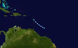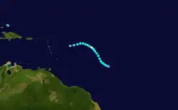 A tropical wave situated about 400 mi (640 km) east of Trinidad developed into a tropical depression on July 25.[12] The depression moved northwestward toward the Lesser Antilles and later that day crossed Barbados with winds of 35 mph (56 km/h). It continued to the northwest and may have struck Martinique on July 26. At 0000 UTC on the following day, the depression dissipated about 30 mi (48 km) west-southwest of Basseterre, Guadeloupe.[2]