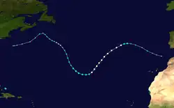 On July 23, a tropical wave emerged into the Atlantic from the west coast of Africa.[13] By 06:00 UTC on July 25, the system developed into Tropical Depression Twelve. Initially, the depression strengthened slowly while moving west-northwestward. Eventually, it was upgraded to Tropical Storm Anna at 06:00 UTC on July 27. Modest intensification ensued during the next 18 hours, after which Anna maintained winds of 60 mph (97 km/h) for nearly two days. At 12:00 UTC on July 30, Anna began to weaken and moved in a more northwesterly direction. By 12:00 UTC on July 31, Anna degenerated into a surface-based trough while situated north of the Lesser Antilles, but continued to produce gale-force winds.[2][4]