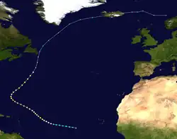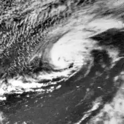 Moving northwestward, Debbie began re-intensifying on August 19, becoming Category 3 hurricane with winds of 115 mph (185 km/h) by 18:00 UTC. By 00:00 UTC on August 20, Debbie peaked with winds of 125 mph (201 km/h), which it maintained for a full day. The storm's minimum barometric pressure of 950 mbar (28 inHg) was measured by hurricane hunters during this timeframe.[2] Debbie curved northeastward as Hurricane Camille moved offshore the East Coast of the United States, weakening to a Category 2 hurricane early on August 21.[2] Gradually losing strength, Debbie passed well to the southeast of Bermuda,[16] although it is believed that if not for the presence of nearby Hurricane Camille, which emerged into the Atlantic from the United States on August 20, Debbie would have likely ended up further west, closer to the island.[17] Debbie accelerated and fell to below Category 2 intensity by 12:00 UTC on August 23. Six hours later Debbie became extratropical while still bearing hurricane-force winds, shortly before passing just offshore Newfoundland. The remnants of Debbie turned northeastward and deteriorated to gale strength late on August 24. About three days later, Debbie's remnants dissipated about 225 mi (362 km) east-northeast of Cape Farewell, Greenland.[2] In Newfoundland, wind gusts up to 85 mph (137 km/h) were observed in St. John's, while rainfall up to 0.98 in (25 mm) was recorded along the Avalon and Bonavista peninsulas.[18] The remnants of Debbie began to lose definition as they accelerated northeastward,[19] while moving over increasingly cold waters. Debbie's remnants finally dissipated west of Norway on August 27.[20][21][22]