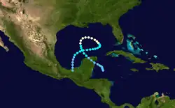 A tropical wave developed into a tropical depression near the Windward Islands on August 29.[2][4] Initially, the depression slowly strengthened while moving west-northwestward and was upgraded to Tropical Storm Francelia until more than 24 hours later. While located north of Honduras, it curved west-southwestward and was upgraded to a hurricane on September 1. Late on September 3, Francelia made landfall near Punta Gorda, Belize with winds of 100 mph (160 km/h). The storm quickly weakened inland, and less than 24 hours later, it dissipated over northern Guatemala.[2] However, the remnants of Francelia later contributed to the development of Hurricane Glenda in the eastern Pacific Ocean.[4]
