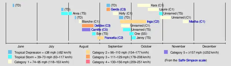 Tropical cyclogenesis began early, with a tropical depression that affected Jamaica. Activity briefly went dormant between June 15 and July 25, when the next depression originated. That same day, the season's first named storm, Anna, developed over the eastern Atlantic. There were five tropical cyclones that formed in the month of August – Blanche, Camille, Debbie, Eve, and Francelia. Camille was the most intense tropical cyclone of the season, peaking as a Category 5 hurricane with maximum sustained winds of 175 mph (282 km/h) and a minimum barometric pressure of 900 mbar (27 inHg).[2]