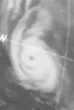 Doris made meteorological history when, on August 31, it became the first Atlantic hurricane ever to be upgraded to hurricane intensity solely on the basis of satellite pictures,[1] via the Dvorak technique.[7] The cyclone then curved northward and intensified further during the next few days, becoming a Category 2 hurricane early on September 2.[3] Based on the Dvorak technique, it is estimated that Doris peaked with maximum sustained winds of 110 mph (180 km/h) and a minimum barometric pressure of 965 mbar (28.5 inHg) shortly thereafter. By September 3, the hurricane began interacting with a non-tropical low pressure area.[7] On the following day, Doris quickly weakened to a tropical storm and transitioned into an extratropical cyclone about 830 mi (1,340 km) south-southeast of Cape Race, Newfoundland, around 06:00 UTC. The extratropical remnants weakened and then dissipated late on September 4.[3]