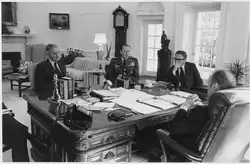 Ambassador Graham Martin, General Frederick Weyand, Secretary of State Henry Kissinger and President Gerald Ford discuss the situation in South Vietnam, 25 March.