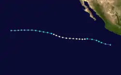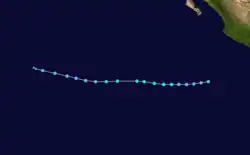Late on August 23, an area of disturbed weather developed about 485 miles (781 km) south of Acapulco, Guerrero.[2] It rapidly coalesced into a tropical depression around 00:00 UTC the next day, but only slowly strengthened into Tropical Storm Iva by 18:00 UTC on August 25.[3] The system moved west and then west-northwest, further developing into a hurricane by 18:00 UTC on August 26 as a small eye became distinct.[2] Iva attained major hurricane strength late on August 27, further intensifying to its peak as a Category 4 hurricane with winds of 130 mph (210 km/h) around 06:00 UTC the following morning.[3] It oscillated in strength over the subsequent 24 hours, but ultimately began a steady weakening trend by August 30 while passing over marginal ocean temperatures.[2] Iva fell to tropical storm strength early that day, weakened to a tropical depression early on September 1, and dissipated around 00:00 UTC on September 2.[3]