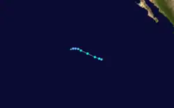 On July 24, a large area of disturbed weather developed about 1,035 miles (1,666 km) southwest of Acapulco, Guerrero. This complex became composed of two distinctly separate areas of low pressure late on July 26.[2] The eastern circulation organized into a tropical depression around 00:00 UTC on July 27 and further strengthened into Tropical Storm Estelle six hours later. Moving swiftly toward the west, the system failed to intensify beyond minimal tropical storm intensity, instead weakening to a tropical depression again by 06:00 UTC on July 28 as it moved into cooler waters. After losing its convective structure, Estelle dissipated around 00:00 UTC on July 29.[2][3]