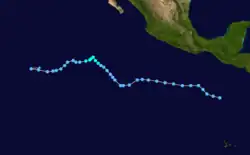 A tropical disturbance was first noted about 345 miles (555 km) south of the Guatemalan coastline on September 27.[2] It organized into Tropical Storm Madeline by 00:00 UTC on September 29 but failed to further develop, instead weakening to a tropical depression the next morning. By 00:00 UTC on October 4, Madeline re-intensified into a tropical storm, beginning a gradual curve toward the north as well. The system continued to strengthen and became a hurricane early on October 6; by 06:00 UTC on October 8, Madline peaked as a Category 4 hurricane with winds of 145 mph (233 km/h). It moved onshore the coastline of Mexico a few hours later, rapidly weakening and losing its status as a tropical cyclone after 18:00 UTC that day.[3]