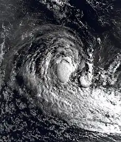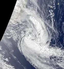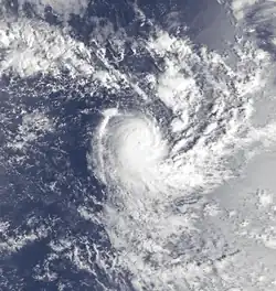 Toward the beginning of January, the ITCZ was active to the northeast of Madagascar, spawning a circulation east of Agalega that became a depression on January 3. On the next day, the system was named Florine. Steered between a ridge to its northwest and northeast, the system moved erratically until January 5, when Florine began a steady movement to the south and later southwest. The change in trajectory was because the ridge to Florine's northeast had weakened. On January 6, the intensifying storm passed just west of St. Brandon, where a station recorded sustained winds of 115 km/h (71 mph) and gusts of 148 km/h (92 mph). A day later, the outer eyewall of Florine moved across Réunion island, while the center of the eye passed 25 km east of Sainte-Rose. Roland Garros Airport recorded a minimum pressure of 935 mbar (27.6 inHg), the lowest on the island. A landfall was spared due to a shift in trajectory to the south-southeast caused by a passing cold front.[6] Also around this time, the cyclone reached its peak intensity according to the JTWC; the agency estimated peak winds of 195 km/h (121 mph), based on a Dvorak rating of 5.5.[7][8] The MFR estimated peak 10 minute winds of 220 km/h (140 mph).[6] Florine weakened as it accelerated ahead of a polar trough, and was no classifiable as a tropical cyclone on January 10. The remnants passed west of Île Amsterdam on the next day and continued southeastward.[6][7]