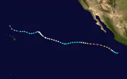 A tropical disturbance south of Acapulco developed into a tropical depression on September 16 and a tropical storm later that day. Kay headed in an irregular but generally west-northwest path out to sea. Kay strengthened into a hurricane on September 17. It continued strengthening and reached its peak as a Category 4 hurricane on the Saffir–Simpson scale on September 18. Kay then slowly weakened and was a tropical storm by September 20. Kay's forward motion slowed as it neared the central Pacific. It restrengthened into a hurricane on September 23, crossed 140°W, and entered the Central Pacific Hurricane Center's area of responsibility the next day.[2] Kay executed a small anticyclonic loop, and then began weakening again. It became a tropical storm again on September 27, and a depression two days later. The cyclone dissipated on September 30 while located north of the Hawaiian Islands.[4] Kay did not effect land, causing no damage or casualties.[2] It was the strongest tropical cyclone of the season at 140 mph (225 km/h). Kay lasted for 14.5 days, enough to make it the fifth-longest-lasting Pacific hurricane at the time.[4]