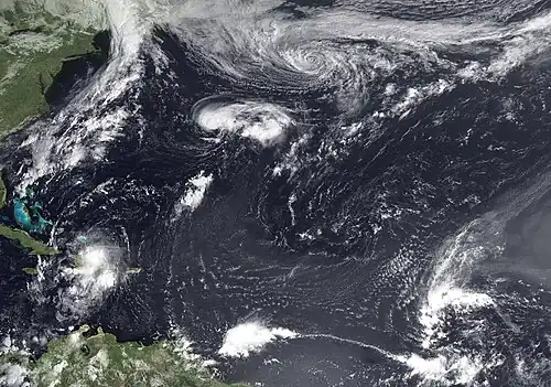 Floyd was first tracked as a tropical depression on September 3 when it organized east of the Leeward Islands. As the depression moved northwest, it caused heavy rain. The highest rainfall reported was 5.7 inches (140 mm) at Antigua. It strengthened into a tropical storm, then reached hurricane strength on September 7.[13] Floyd turned to the northeast and passed just southeast of Bermuda as a weakening hurricane. As a tropical storm, Floyd moved east across the Atlantic until losing its identity on September 12.[13]