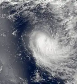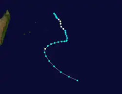 Several areas of convection persisted within the ITCZ in early March across the open Indian Ocean. One of these organized into a tropical storm on March 2 about 700 km (430 mi) south of Diego Garcia and was given the name Daodo.[21][22] On the following day, the JTWC began tracking it as Tropical Cyclone 21S.[2] Daodo moved slowly initially while quickly strengthening into a severe tropical storm. On March 4, a weak ridge steered the storm to the east, and the storm weakened slightly during this time. Three days later a stronger ridge to the east turned Daodo to the southwest, bringing it over its former path. On March 8, the JTWC upgraded the storm to the equivalent of a minimal hurricane. On the following day, the MFR upgraded Daodo to tropical cyclone status, estimating peak 10 minute winds of 135 km/h (85 mph), although it weakened back into a tropical storm on March 10. The storm accelerated to the southeast on the next day and maintained much of its intensity due to baroclinic interactions with a nearby anticyclone. On March 13, Daodo turned back to the southwest before moving more southward and later to the southeast. On March 18, the storm dissipated within a polar trough northwest of Île Amsterdam.[21][22]