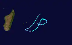 While Bemezava was still active, another circulation was present between Réunion and Madagascar on February 8. On the next day, a tropical disturbance formed about 150 km (95 mi) east-southeast of Toamasina, Madagascar. A ridge to the south caused the nascent system to move erratic, although generally to the southeast and east. It intensified into Tropical Storm Clotilda on February 10,[16][17] and on the next day that the JTWC classified it as Tropical Cyclone 17S.[2] The storm slowed and approached within 50 km (30 mi) of Réunion before stalling. It moved slowly near the island for two days, during which it remained about 30 km (18 mi) off the northern coast. On February 13, Clotilda attained peak 10 minute winds of 110 km/h (70 mph). A weak ridge steered the storm back to the southwest, and on February 14, Clotilda struck northern Réunion at Sainte-Suzanne. The ridge moved to the east, causing the storm to accelerate and gradually weaken. On February 17, Clotilda became extratropical while turning southeastward due to an approaching trough. The remnants persisted several days until dissipating on February 22 near Île Amsterdam.[16][17]