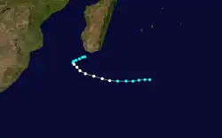 In addition to the storms classified by the MFR, the JTWC tracked four additional storms. The first, classified as Tropical Cyclone 01S, formed on August 1 in the northeastern portion of the basin,[2] an infrequent event for the time of year.[7] The storm moved westward with peak 1 minute winds of 85 km/h (55 mph). It gradually weakened, dissipating on August 3 near Diego Garcia.[8] The JTWC also tracked a short-lived storm in January that they classified as Tropical Cyclone 06S. The storm formed on January 7 in the eastern portion of the basin near Diego Garcia, and reached winds of 85 km/h (55 mph) while moving southeastward. After stalling on January 9, the system dissipated three days later.[2][9] Later, the agency monitored Tropical Cyclone 26S beginning on April 24. The storm formed south of Diego Garcia and moved in a counterclockwise direction, first to the southeast and later to the north. After reaching peak 1 minute winds of 85 km/h (55 mph), the storm dissipated on April 26.[2] The final storm tracked by the agency originated on June 25 in the far northeastern portion of the basin between Diego Garcia and the Cocos Islands. It moved slowly to the southwest, failing to intensify beyond winds of 65 km/h (40 mph). Turning to the southeast, the system dissipated on June 27.[2]