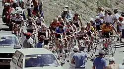 The night before stage 18 to Alpe d'Huez, Hinault called a team meeting, complaining about the fact that Zimmermann now split the two La Vie Claire riders. He called for the team to attack Zimmermann the following day, "until he was broken". Another dispute broke out with LeMond, who pointed out that with a time trial still to come, a discipline that did not favour Zimmermann, there was no need for an all-out attack.[71] Tapie had to talk to the riders until four o'clock in the morning to handle the situation.[72] Shortly after the start of the stage in Briançon, the first climb of the day was the Col du Lautaret. A breakaway formed, including Herrera and Winterberg, who left their companions on the following climb, the Col du Galibier. Behind them, in the group of favourites, Zimmermann was closely guarding LeMond, while Hinault made several small accelerations to test the opposition. On the descent of the Galibier, Hinault attacked, only 150 km (93 mi) into the stage. He caught Herrera and Winterberg and they were joined by LeMond, Bauer and Ruiz Cabestany. As they reached the next small climb, the Col du Télégraphe, Hinault attacked again, going clear on his own. LeMond, having strict instructions from his team not to work with Zimmermann, was again stuck behind. LeMond dropped back to his team car for instructions by coach Paul Köchli, who urged him to attack Zimmermann instead of leading him towards Hinault, who at that point had a lead of about one-and-a-half minutes. LeMond attacked shortly before the summit and opened up a gap to Zimmermann on the descent, eventually catching up to Hinault, together with Bauer and Ruiz Cabestany. Bauer then did the lead work until the foot of the next climb, the Col de la Croix de Fer, where he dropped back. Ruiz Cabestany fell behind soon after.[73] On the ascent, Hinault asked LeMond to ease the tempo, due to his aching knee, and set the pace himself. By the summit, they led Zimmermann by 2:50 minutes. On the descent, both set a high tempo, extending the lead over Zimmermann to 4:30 minutes as they reached the climb of Alpe d'Huez.[74] Sensing that the French public, clearly favouring Hinault, made LeMond nervous,[75] the former led all the way up the climb, with both riders steadily increasing their advantage over everybody else.[76] Close to the finish line, LeMond drove alongside Hinault, putting his arm around him for a short conversation. At the finish, Hinault took LeMond's hand in an apparent gesture of comradery and they crossed the line together, with Hinault taking the stage win.[74][77] Tapie later revealed that he had orchestrated the moment, having told LeMond before the climb to Alpe d'Huez that he had effectively won the race and that he should let Hinault take the stage.[78] Zimmermann finished third, 5:15 behind the pair.[75]