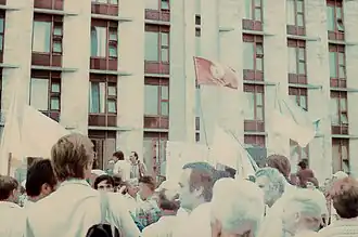 The role of national issues in the strikes has been disputed, particularly in the Donbas. In a May 1991 interview, Donbas strike leaders Mykhail Krylov and Yuri Makarov expressed the belief that an independent Ukrainian state would ensure Ukraine's economic self-governance and viewed it as positive.[12] Krylov later claimed in a 2009 interview that "We never pursued the goal of Soviet collapse. We were against the people in power, rather than the country,"[13] but chairman of the Independent Miners' Union of the Donbas Mykola Volynko said in 2015 that sentiments opposed to Ukrainian independence only arose during the 2014 pro-Russian unrest in Ukraine. Volynko noted that miners from the city of Pervomaisk, Luhansk Oblast helped to erect the flag of Ukraine at the Kyiv City Council building in 1990.[14]