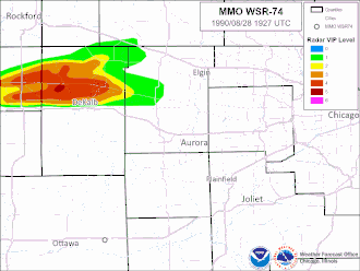 The "HP" supercell produced multiple funnel sightings, hail damage, and damaging winds south of Rockford before heading southeast toward Will County and dropped a rain wrapped tornado. This is why many in the path did not see the actual tornado but more of a wall of water and dark clouds coming toward them. As the storm continued south it produced a 16-mile (26 km) swath of damage ranging from F1 to F5 intensity. The National Weather Service in Rosemont, Illinois, serving all of Central and Northern Illinois at the time, did not issue a Tornado Warning until 10 minutes after the tornado had hit Plainfield. Despite radar technology being less developed than now, the storm had a well defined hook echo on radar imagery, a signature often correlated with tornadic supercells.