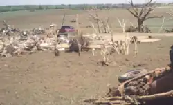 Twelve people died in Bridge Creek, nine of whom were in mobile homes; all fatalities and the majority of injuries were concentrated in the Willow Lake and Southern Hills Additions and Bridge Creek Estates, consisting mostly of mobile homes. Over 39 people were injured in the area as well.[25][27] Continuing northeastward, the tornado briefly weakened to F4 status before re-strengthening to F5 intensity as it neared the Grady-McClain County line, where a car was thrown roughly 0.25 mi (0.40 km) in the air, and a well-built home with anchor bolts was reduced to a bare slab.[25] At this time, it had attained a width of one mile (1.6 km), having grown to its largest width after crossing the South Canadian River into the southern Oklahoma City limits. The tornado then became quickly rain-wrapped; Jim Gardner, then-helicopter pilot for KFOR-TV, reported during the station's live coverage of the storm that the tornado was at least one mile wide, and was embedded (or "rain-wrapped") in the precipitation core associated with the main circulation, making it difficult to see.[21]