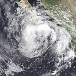 Early on October 9, the center of the storm passed within about 85 miles (137 km) of the coastline between Manzanillo and Cabo Corrientes.[31] The storm then curved west-northwestward and at 1800 UTC on October 9, Irwin attained peaked with winds of 60 mph (97 km/h). Stable air and increasing wind shear caused Irwin to weaken and fall to tropical depression intensity early on October 11. About 12 hours later, the storm dissipated while located about 405 miles (652 km) southwest of Cabo San Lucas.[31] While passing offshore, Irwin brought patches of heavy rainfall to some areas of Mexico, peaking at 9.92 inches (252 mm) in Coahuayutla de Guerrero, Guerrero.[12]
